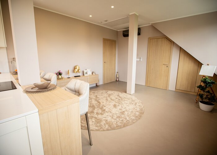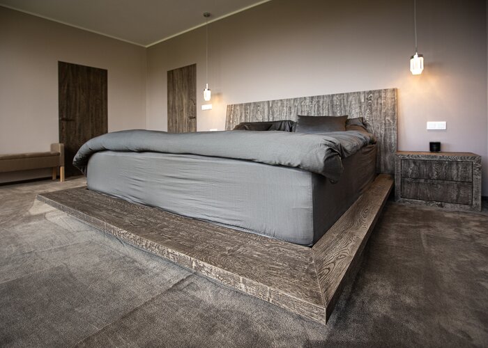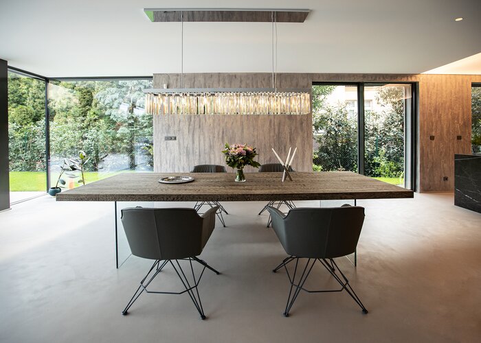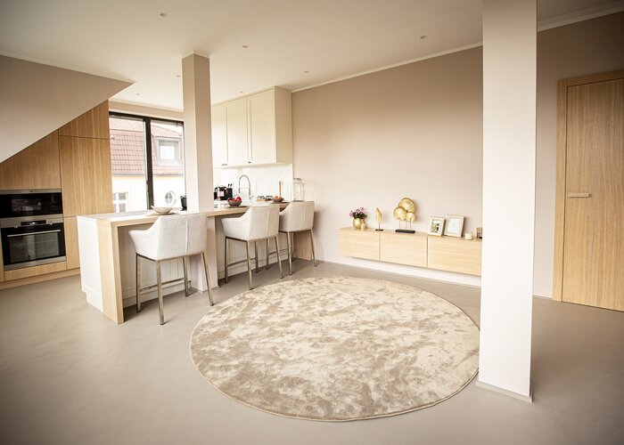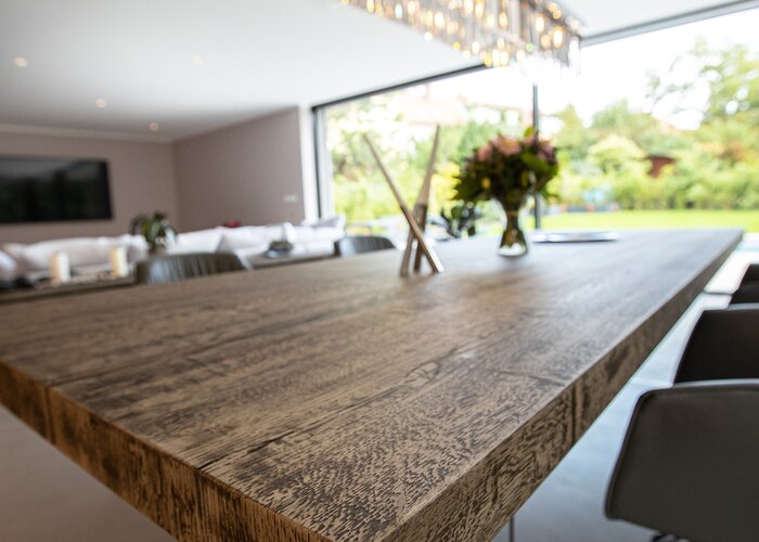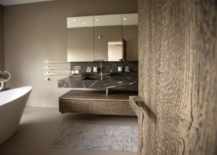 Tuto speciální povrchovou úpravu vytvořenou na míru najdete na kuchyňské lince, jídelním a konferenčním stole, v zádveří i koupelně, schodech nebo třeba na dveřích a okolním obložení. Tento společný prvek – starý dub s patinou – dokonale ladí s tlumeným šedobéžovým nátěrem stěn, propojuje celý interiér a dodává mu dojem klidné elegance. Vila tak ani přes některé studeně působící moderní materiály – jako je chromový povrch lustru nad jídelním stolem, hladká betonová podlaha, ocelové podnože židlí nebo kuchyňský ostrůvek s povrchem vyvedeným v černém mramoru – vůbec nevyvolává pocit odtažitosti a neosobnosti, ale naopak působí velice příjemně. V bytě dcery byla na nábytku a dveřích použita dubová dýha mořená na světlý odstín mořidlem Arova Spritzbeize Weiss a dokončena transparentním dvousložkovým PUR lakem na nábytek Ratiopur G10/Legnopur G10. Ten dodal požadovanou trvanlivost a odolnost a zároveň nechal vyniknout bíle mořenému dubu. Interiér s čistými liniemi nábytku tak působí svěže a vzdušně – přesně tak, jak si to mladá dáma přála. Jak je vidět, spolupráce odborníků, kteří do své práce dávají srdce, přináší vskutku výjimečné výsledky. A použití produktů ve vysoké kvalitě a se špičkovou výdrží je pomyslnou korunou celého projektu.