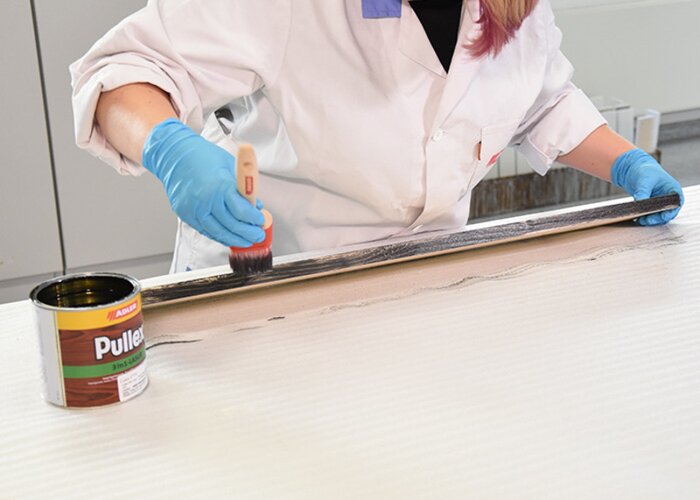 Okartáčované a očištené dřevo natřete lazurou Pullex 3in1-Lasur v odstínu RAL 9005. Nátěr se nejsnáze aplikuje pomocí profesionálního štětce na rozpouštědlové lazury Solvamaxx. Při natírání postupujte nejdříve od hran.
